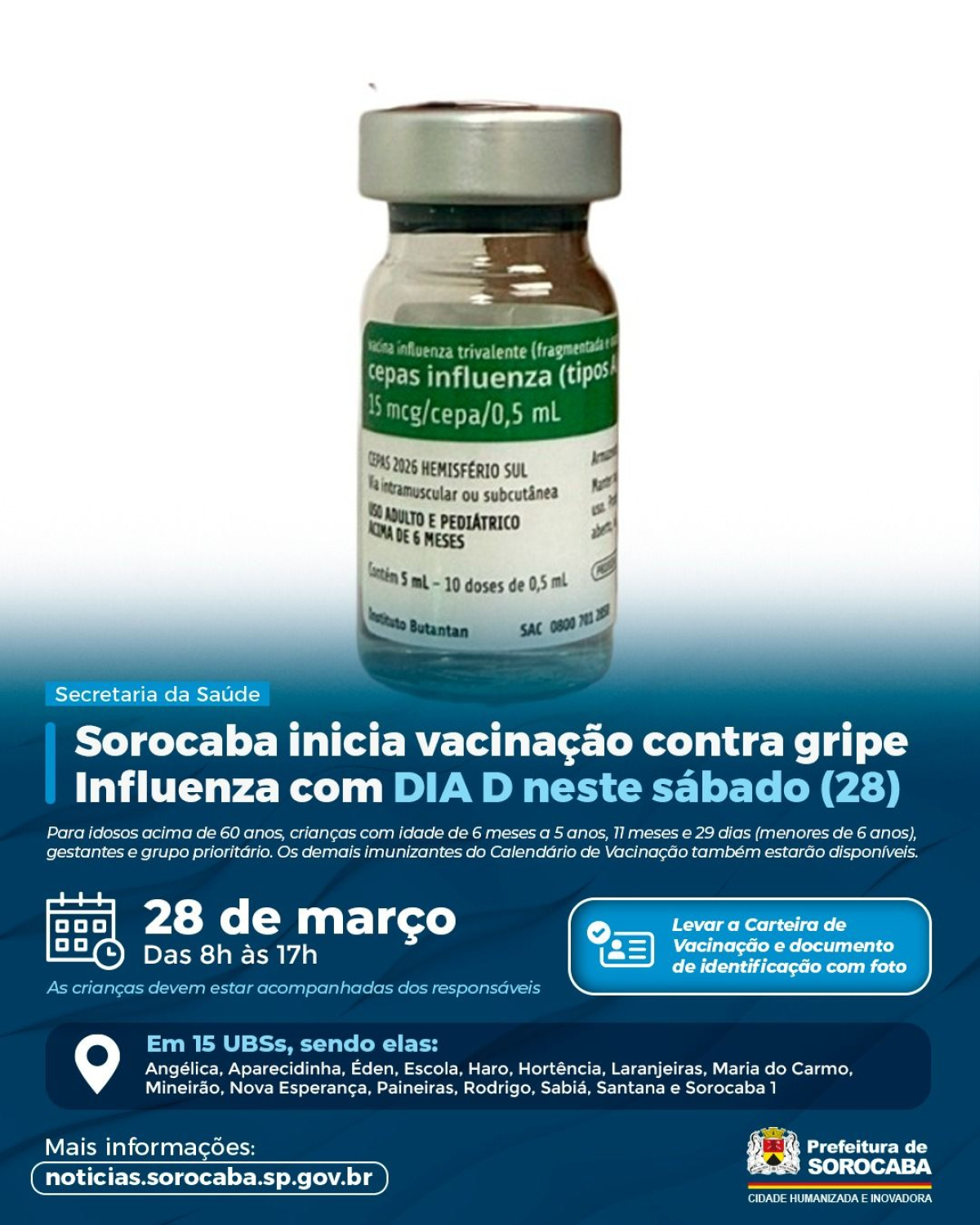 Em Sorocaba, o início da campanha será marcado pelo Dia D, que será realizado no dia 28 de março, com atendimento em 15 Unidades Básicas de Saúde (UBSs), das 8h às 17h.